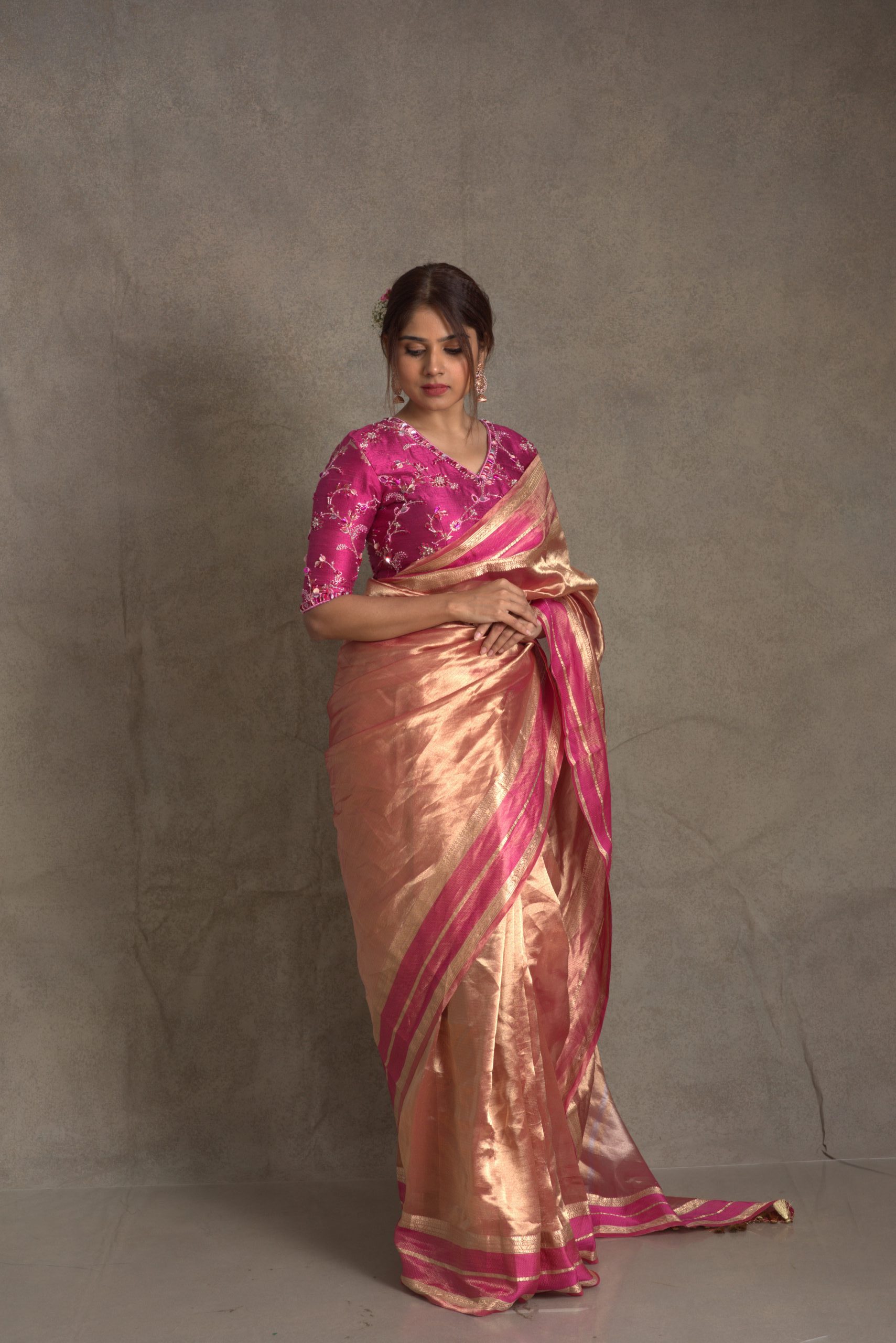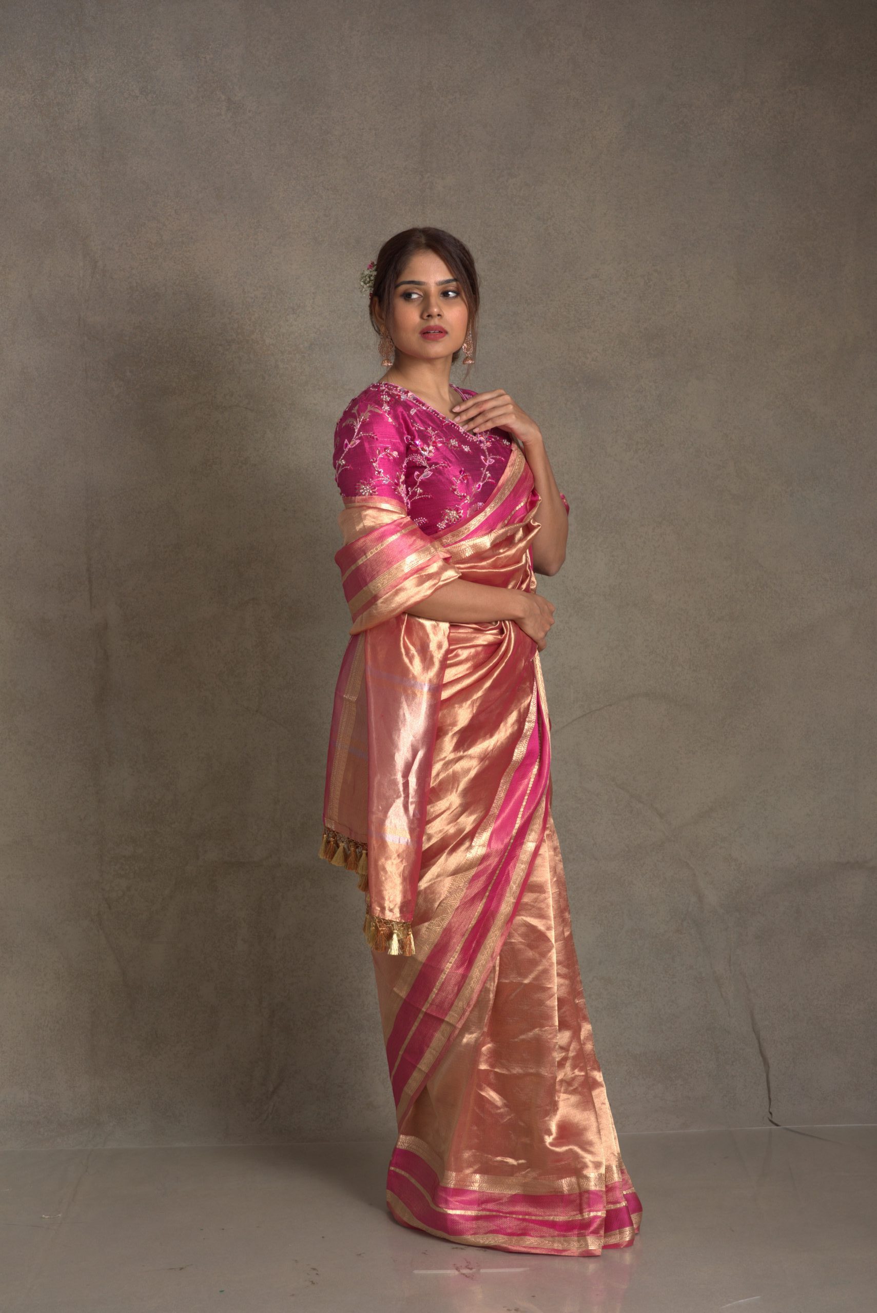 Featuring here is a golden tissue banarasi saree woven in Katan borders in contrasting pink borders comes with 2 blouse materials as an addition Blouse material Brocade in pink (no embroidery)& running blouse material from saree